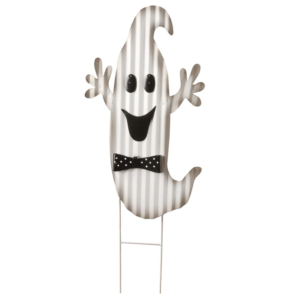 Handcrafted from metal and steel components and painted in white with contrasting black mouth and eyes, this Halloween decoration is a spooky addition to garden, porch or patio. A black bow tie with white polka dots adds a fun element to this startling spirit. Wire frame base provides ground stake for easy display.