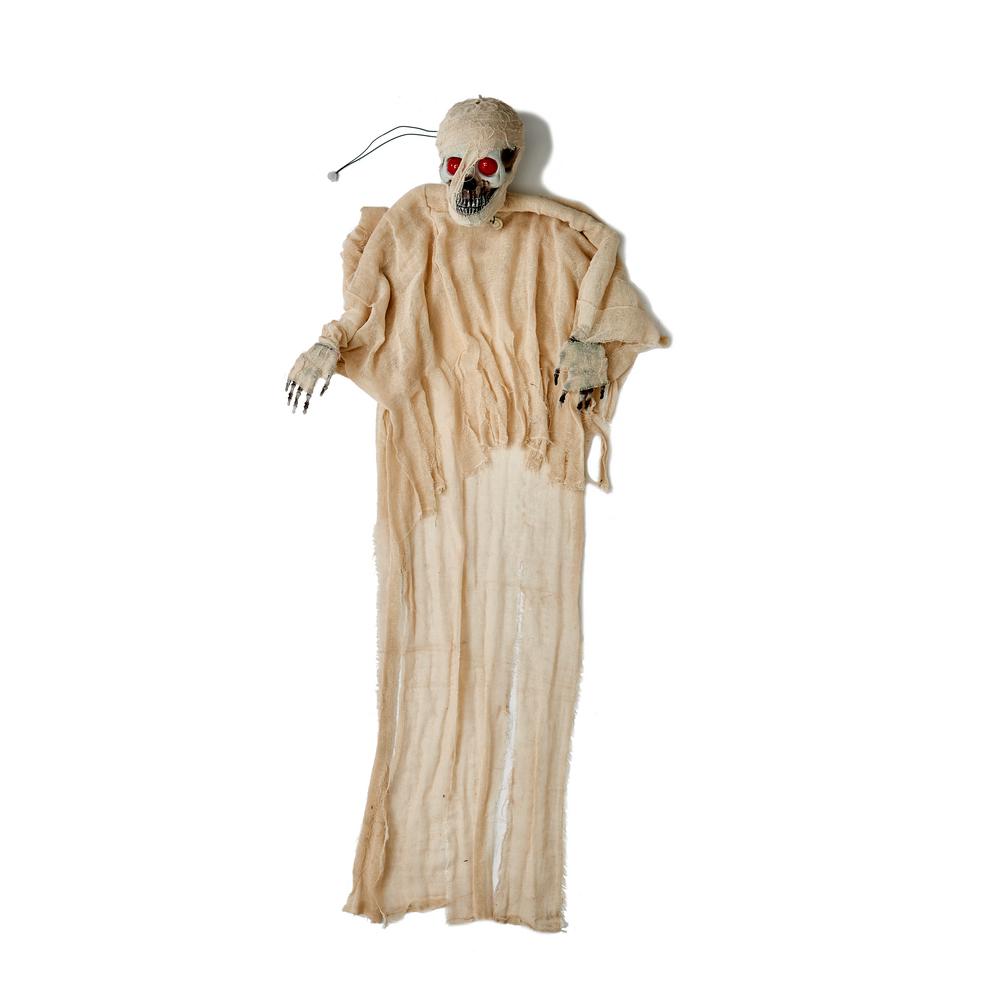 Add drama to your Halloween with our lifesize hanging mummy. The mummy has realistic bandaging covering its skull, hands and body. Make a sound and the mummy comes to life with flashing eyes and scary laugh.